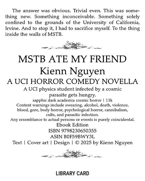 Now, my training in physics left me with a great deal of trust in textbooks and literature. But a tortured student knows when to give up. Reading that book of cryptids, I knew. The answer was obvious. Trivial even. This was something different. Something inconceivable. Something confined to the grounds of the University of California, Irvine. And to stop it I had to kill the thing inside the walls of MSTB.
