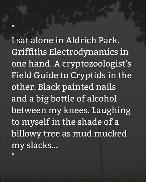 I sat alone in Aldrich Park. Griffiths Electrodynamics in one hand. A cryptozoologist's Field Guide to Cryptids in the other. Black painted nails and a big bottle of alcohol between my knees. Laughing to myself in the shade of a billowy tree as mud mucked my slacks...